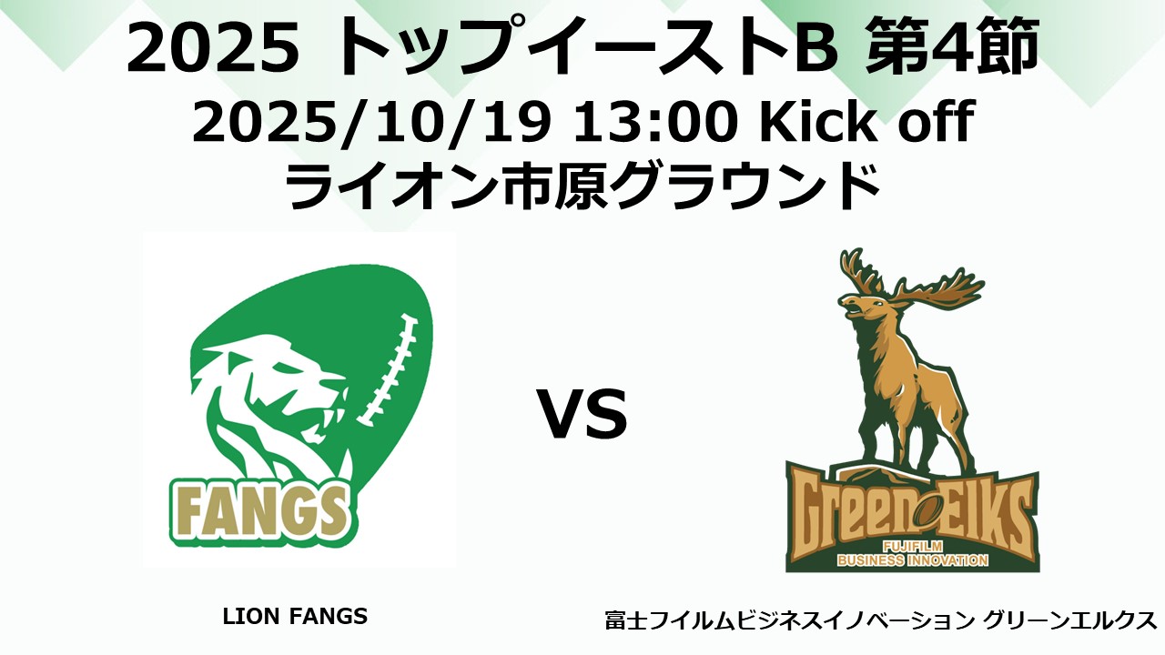10月19日(日)は2025トップイーストB 第四節 ライオンファングス戦となります。